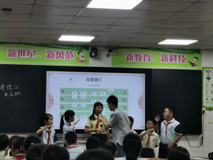 活動(dòng)伊始,由巫勇華老師執(zhí)教一節(jié)古詩(shī)吟誦教學(xué)課。巫老師將《宿建德江》這首詩(shī)中的意象繪制成了一幅充滿意境的畫卷,帶領(lǐng)孩子們走進(jìn)古詩(shī),品味詩(shī)文,感悟詩(shī)文之美。本課最大亮點(diǎn)是能采用聲韻分析的方法,教會(huì)學(xué)生在吟誦中引導(dǎo)學(xué)生理解古詩(shī),并抓住“舟”、“日暮”、“月”等字,從意象的角度分析這些字的深刻涵義,讓學(xué)生們體會(huì)到關(guān)鍵字詞的理解能在古典詩(shī)文中領(lǐng)悟古詩(shī)的文化背景。