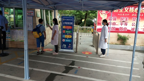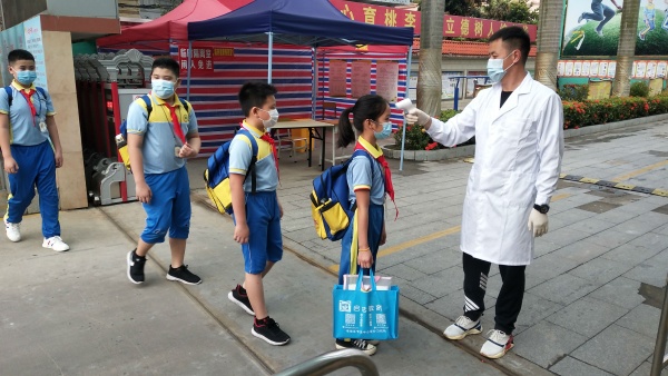 今天是華文學(xué)校四——六年級學(xué)生返校復(fù)學(xué)的日子。雖然已過立夏,但偉人故里的中山依舊有些涼意,還下起了小雨,早上6點(diǎn)20分,謝春生校長就帶領(lǐng)行政、教師們在校園里巡視檢查、在校門口歡迎學(xué)生們的到來。認(rèn)真負(fù)責(zé)的體溫檢測人員、和藹可親的值日教師讓學(xué)生們樂在其中。
