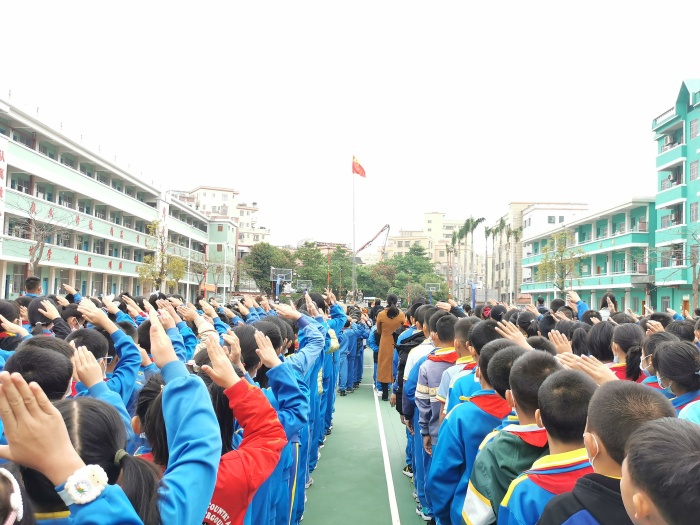 春風(fēng)微涼,師生熱情卻不曾退卻。8點(diǎn)30分,在雄壯的進(jìn)行曲中,國(guó)旗護(hù)衛(wèi)隊(duì)隊(duì)員們邁著矯健的步伐走向旗臺(tái),和著嘹亮的歌聲,激昂的青春美麗綻放;伴著燦爛的笑容,鮮艷的五星紅旗迎風(fēng)飄揚(yáng)。