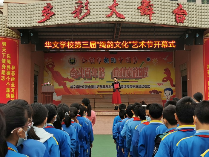 紅色三月,中國(guó)夢(mèng)的精神呼喚華文人腳踏實(shí)地地前行;激情三月,華文校園蕩漾著華文人對(duì)藝術(shù)的憧憬與追求。為慶祝黨的百歲生辰,傳承黨的光榮傳統(tǒng)和優(yōu)良精神,繁榮校園文化、倡導(dǎo)精神文明、塑造優(yōu)良品格、陶冶高尚情操,讓同學(xué)們崇尚文化、熱愛藝術(shù)、熱愛人生,華文學(xué)校于3月22日上午舉行慶祝建黨百年暨第三屆“繩韻文化”藝術(shù)節(jié)開幕式。本次活動(dòng)由德育處荀丹副主任主持。