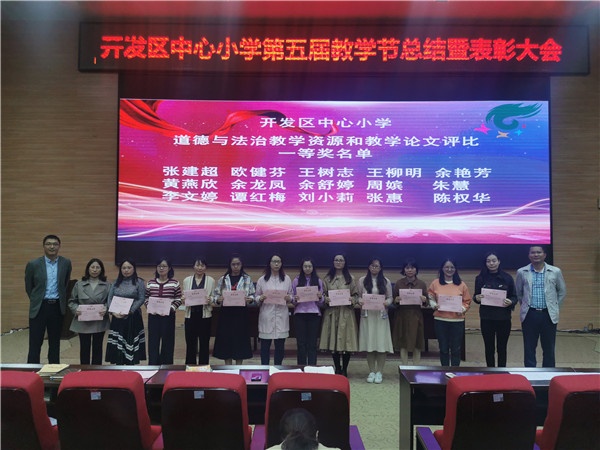 活動伊始,教導(dǎo)處主任劉愛紅從“三個感謝、兩條主線、一個目標”三個模塊共五個方面對本屆教學(xué)節(jié)進行了全方位的回顧與總結(jié)。劉主任滿懷激情地對在本屆教學(xué)節(jié)期間踴躍報名參賽的教師給予了中肯的贊譽,極大地鼓舞了現(xiàn)場在座老師。隨后舉行了隆重的頒獎儀式。劉剛毅校長、楊異偉副校長分別為在道德與法治教學(xué)資源和教學(xué)論文獲得一等獎的教師頒發(fā)獎狀并合影留念。
