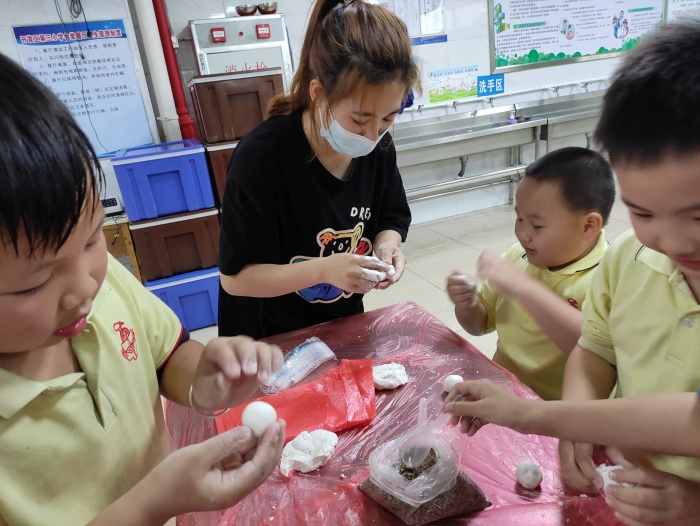 首先,孩子們洗干凈雙手,挽起衣袖,有模有樣的學(xué)著爸爸媽媽的樣子包起湯圓:先拿和好的糯米粉團(tuán)揪一小團(tuán),糯米面,讓孩子們擠壓成圓片形狀,再挑一團(tuán)餡放在糯米片上,最后用雙手轉(zhuǎn)邊收口做成一個小圓球??粗粋€個圓溜溜的湯圓真可愛!緊接著,煮湯圓時,先燒開水,把湯圓慢慢放入鍋內(nèi),輕輕的攪開,湯圓浮出水面代表已經(jīng)煮熟。活動最后,家長伴著《賣湯圓》的優(yōu)美旋律和孩子們一起品嘗著自己的勞動成果,每個人的臉上都洋溢著過節(jié)的喜慶。
