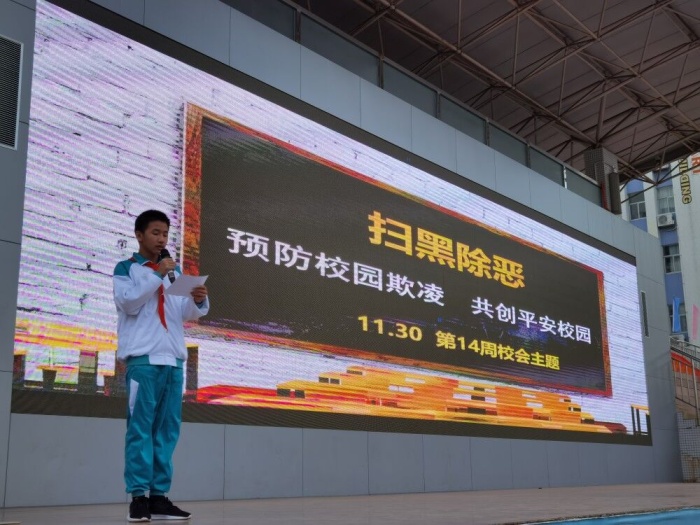 校會(huì)上,顏良江副校長從從思想認(rèn)識到位、安排部署到位、深入摸排到位、精準(zhǔn)打擊到位四個(gè)方面進(jìn)行全面講解,讓同學(xué)說深入了解了“黑惡必除,除惡務(wù)盡”的重要性,校園暴力的危害性。同時(shí)倡議全校學(xué)生:當(dāng)受到黑惡勢力欺凌時(shí),要及時(shí)向老師、家長及警察求助。當(dāng)看見別的同學(xué)受到欺負(fù)時(shí),也要向?qū)W校和老師報(bào)告,主動(dòng)揭發(fā),不包庇不縱容。