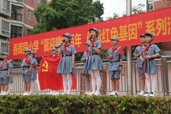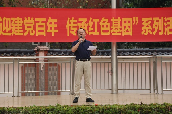 活動(dòng)伊始,操場(chǎng)上奏響出旗曲,十位升旗隊(duì)的同學(xué)踏著矯健的步伐,以飽滿的熱情護(hù)衛(wèi)五星紅旗進(jìn)場(chǎng)。莊嚴(yán)雄壯的《義勇軍進(jìn)行曲》隨后響起,鮮艷的五星紅旗冉冉升起,臺(tái)下師生分別行注目禮和少先隊(duì)隊(duì)禮。簡(jiǎn)單而莊重的升旗儀式后,香暉園小學(xué)黨支部委員、副校長劉裕上臺(tái)講話。劉副校長在講話中指出,歷史是一面鏡子,它照進(jìn)現(xiàn)實(shí),也照亮未來,學(xué)習(xí)黨的歷史,了解過去,才能看清前進(jìn)的方向,他以“少年強(qiáng)則國強(qiáng)”鼓勵(lì)全體少先隊(duì)員,勉勵(lì)他們作為祖國的未來和民族的希望,學(xué)黨史,感黨恩,聽黨話,跟黨走,牢固樹立社會(huì)主義核心價(jià)值觀,在學(xué)習(xí)和生活中傳承紅色基因,努力成長為德智體美勞全面發(fā)展的社會(huì)主義建設(shè)者和接班人。講話結(jié)束后,劉副校長宣布香暉園小學(xué)“喜迎建黨百年 傳承紅色基因”系列活動(dòng)暨黨史學(xué)習(xí)教育啟動(dòng)。