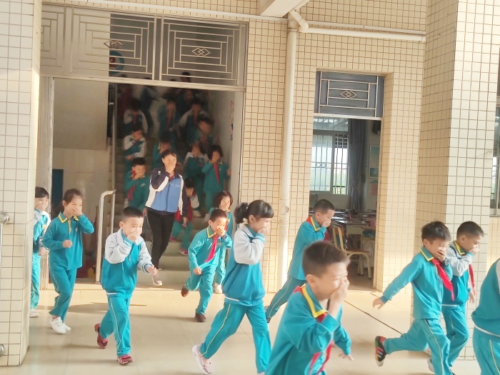 8點(diǎn)整,隨著警報(bào)聲響起,各班班主任和科任教師及時(shí)準(zhǔn)確地組織學(xué)生,迅速進(jìn)入緊急疏散狀態(tài)。在老師的帶領(lǐng)下,全體學(xué)生彎著腰、貓著步,用手帕、毛巾等捂住口鼻,快速而有序地按預(yù)定疏散路線,從“災(zāi)害現(xiàn)場(chǎng)”逃離,疏散到學(xué)校的操場(chǎng)上。1400多名師生訓(xùn)練有素地從各個(gè)室場(chǎng)撤離到學(xué)校小操場(chǎng)空地,隨后各班班主任清點(diǎn)人數(shù),匯報(bào)給學(xué)校安全主任。能如此快速有序地撤離,得益于浪網(wǎng)小學(xué)平時(shí)對(duì)安全工作的重視,師生們?cè)谑枭r(shí)牢記注意事項(xiàng)與撤離路線。