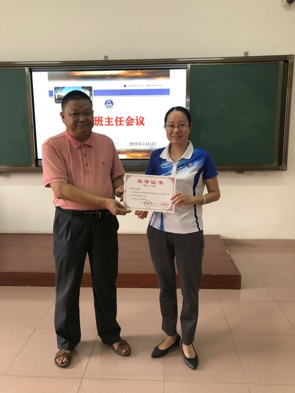 最后,吳美霞老師替張馨月同學(xué)接受胡校長頒發(fā)的市自強好少年和自強少年標兵獎項。