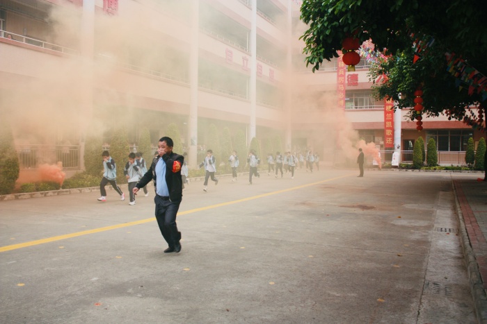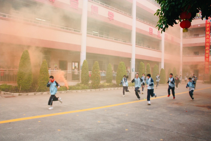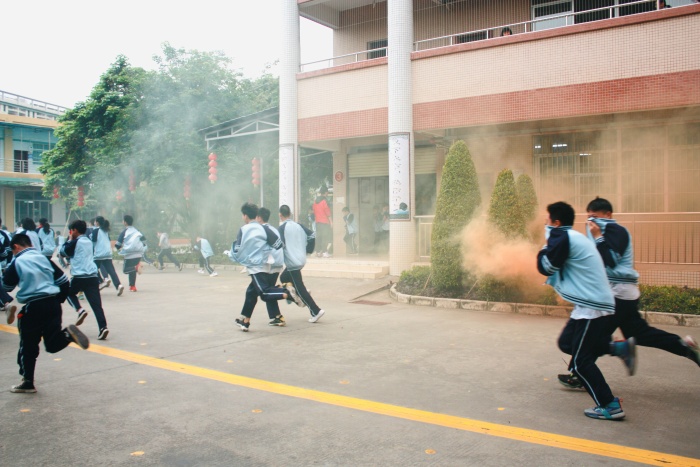 演練開始前刻,安全處臨時召開了非第一節(jié)授課教師緊急專題會議,對各樓層值崗教師進(jìn)行了嚴(yán)密的安排和明確的崗位職責(zé)要求,以確保全體學(xué)生能迅速、安全、有序撤離,嚴(yán)防逃生時出現(xiàn)踩踏事故。待全體值崗教師到達(dá)指定位置后,工作人員立即拉響警報(bào),各班授課老師在不知情的情況下,迅速組織學(xué)生進(jìn)入緊急疏散狀態(tài)。全體學(xué)生在授課教師和值崗教師的指揮下,彎著腰,貓著步,用衣服一角捂住口鼻,沿著教學(xué)樓各個樓梯口快速逃生,有序撤離到學(xué)校操場的安全地帶。經(jīng)計(jì)時,從警報(bào)響起到最后一個學(xué)生撤離教學(xué)樓,共計(jì)用時不到4分鐘。