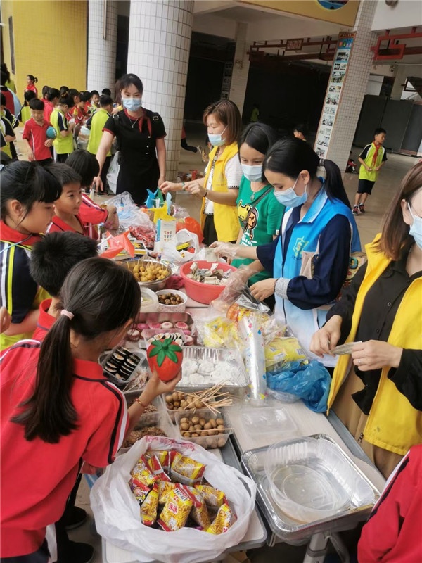 現(xiàn)做美食、扔圈套物、精品文具、零食禮包……同學(xué)們、家長(zhǎng)義工的角色多變,售貨員、收銀員、推銷員隨處可見。各個(gè)攤位都使勁渾身解數(shù),招攬一批又一批的小客戶。一件件充滿愛心的賣品,一張張純真可愛的笑臉,一聲聲此起彼伏的吆喝,使整個(gè)操場(chǎng)一下子匯成了歡樂的海洋,給春意盎然的校園增添了更多生機(jī)和活力?!疤钥汀眰兇┧笤诹x賣校道上,開心地尋找自己心儀的寶貝,其中不乏老師們,為了支持愛心活動(dòng)的開展,老師們也加入了“淘寶”大軍。