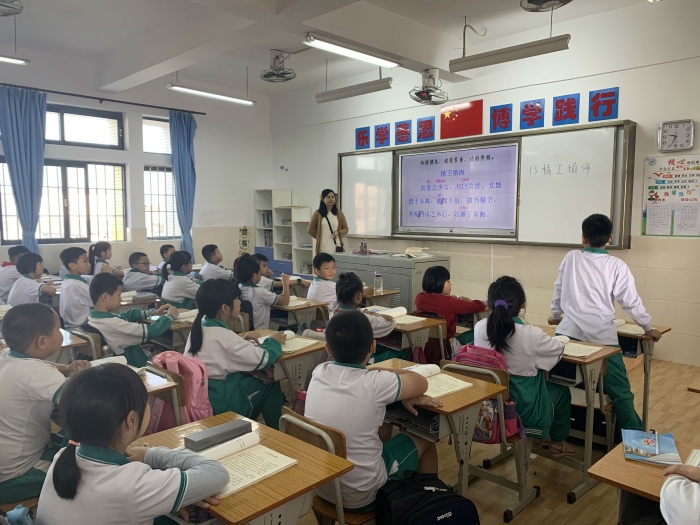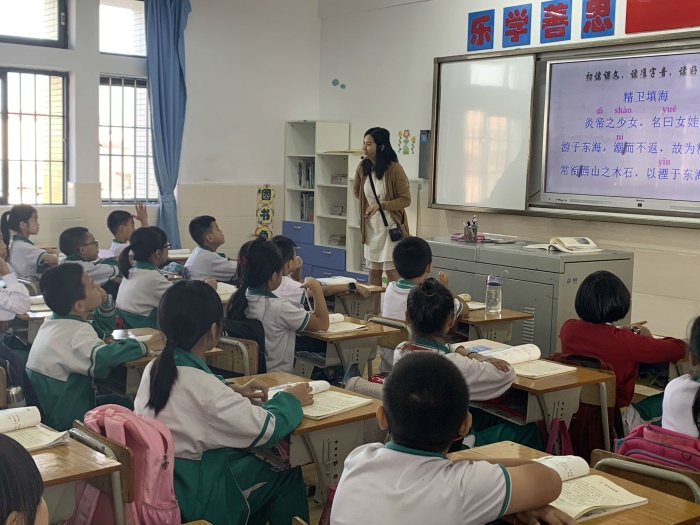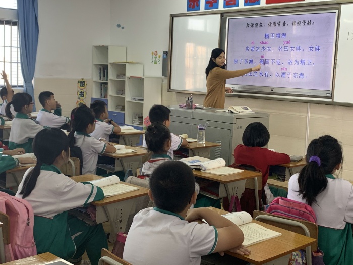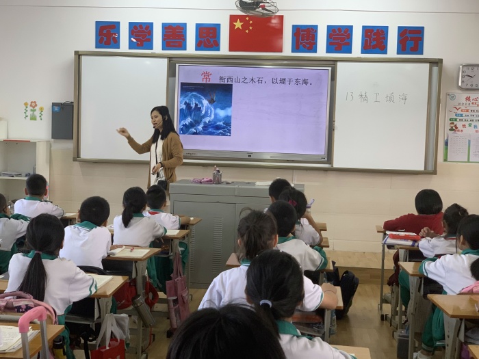 本次骨干教師示范課活動是余燕老師執(zhí)教,內(nèi)容是四年級語文上冊《精衛(wèi)填?!贰T诒竟?jié)課中,余老師教學流程環(huán)環(huán)相扣、教學技巧嫻熟自然、課堂氣氛和諧融洽,充分展現(xiàn)出語文課堂的精彩,使聽課教師們從中得到了很好的啟示,紛紛表示受益匪淺。在教學片段中,余老師引導學生充分利用注釋及生活經(jīng)驗,引導學生通過聯(lián)系上下文理解文言文,并引導學生在感悟神話故事的神奇性過程中,通過對課文內(nèi)容的解讀,從而發(fā)現(xiàn)神話故事的特點——神奇。