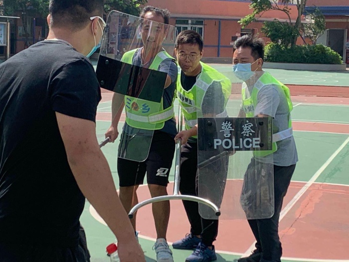 接著,鄭觀明警官和黃偉龍警官宣布大家進(jìn)入“突發(fā)事件應(yīng)急處置”演練環(huán)節(jié)。情境設(shè)定:由一名便衣民警同志模擬充當(dāng)危險(xiǎn)分子的角色,手持兇器對(duì)護(hù)校隊(duì)員進(jìn)行攻擊,試圖沖擊校園安保防線。護(hù)校隊(duì)當(dāng)即進(jìn)入突發(fā)情況應(yīng)急狀態(tài),保安和護(hù)校隊(duì)員們快速組成合作小組,一邊利用手中的鋼叉、盾牌和警棍等器械與危險(xiǎn)分子周旋,同時(shí)啟動(dòng)一鍵報(bào)警系統(tǒng),護(hù)校隊(duì)員們各就各位,迅速聯(lián)系肖家村派出所和西山村委治保會(huì)力量,協(xié)力將危險(xiǎn)分子制服。