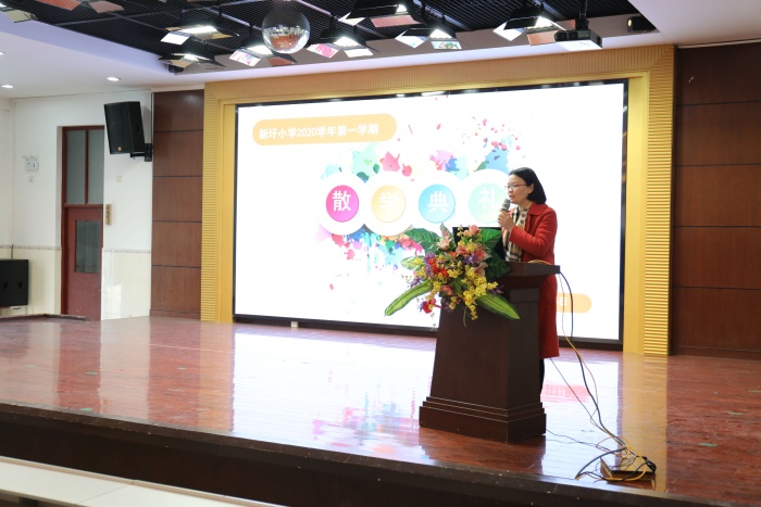 散學(xué)禮由練海燕主任主持,首先朱華春副校長借助圖片與全體師生一起回顧了本學(xué)期在教學(xué)、德育、少先隊(duì)等方面的精彩活動(dòng),一張張照片記錄了本學(xué)年師生成長的印跡。朱校長表彰了期末考試中獲得優(yōu)異成績的個(gè)人和集體。接下來則是教師代表胡曉華老師發(fā)表主題為“我的學(xué)習(xí)我做主”的講話,分析了學(xué)習(xí)收獲多少的原因在于學(xué)習(xí)態(tài)度、主動(dòng)學(xué)習(xí)和自主努力這三個(gè)方面。學(xué)生代表五3班張文婷在講話中分享了閱讀競賽的經(jīng)驗(yàn);要善于積累,把自己帶進(jìn)書中,閱讀訓(xùn)練要記錄自己的答題思路、規(guī)定答題時(shí)間和遵循先易后難的原則。讀書是制勝法寶,秘訣在于多讀多練。