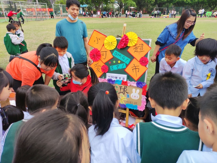 義賣以學(xué)生班級為單位開展擺攤,還邀請了部分學(xué)生家長加入其中?;顒?dòng)現(xiàn)場熱鬧非凡,每個(gè)攤位都有各自精心設(shè)計(jì)的特色廣告宣傳海報(bào),小小售貨員、收銀員、推銷員等也在自己的攤位前賣力經(jīng)營,吸引了大大小小的“買家”們上前選購。
