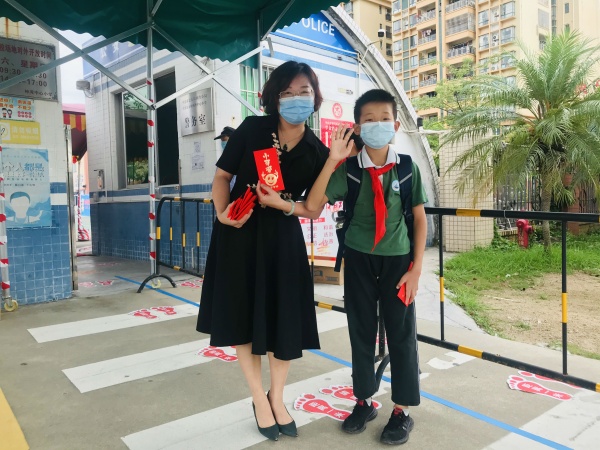 得益于前期返校準備工作的踏實開展、有效落實,盡管半程下起了小雨,但整個返校過程依然順利而又流暢,完美詮釋了劉勰先生的那句“千曲而后曉聲,觀千劍而后曉器”。中山市教育工委疫情防控黨員服務隊工作人員李衛(wèi)政同志在作為路隊返校學生入口的東門門口,查看了學校入校測溫區(qū)的設置、學生進校的監(jiān)測管理流程等,譚瑞香校長、梁海英副校長用親切的笑容、溫和的語言和得體的手勢,迎接學生的到來,指引他們在制定的班級區(qū)域排隊等候,遵照路面指示保持間距,按要求測量體溫,并貼心地為每一位返校學子準備發(fā)放了開學禮物:一份校長寄語,包含的是對他們返校的歡迎和期盼;一支糖果,表達的是對他們學習生活的祝福和希望。一句親切的“歡迎回來”、一個簡單的“開學紅包禮”,傳遞了上級領導們的關心和重視,傳達出師生期盼已久終于相見的喜悅,學生們也為這真誠的熱情所感動、為學校溫馨和諧的氣氛所感染,一個個臉上展露出靦腆卻依然溫暖的笑容。見此情景,李衛(wèi)政同志說道,禮物雖小但情意濃厚,為細心的神小家庭、幸福的神小學子點贊。