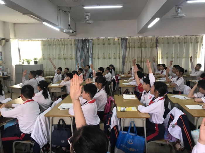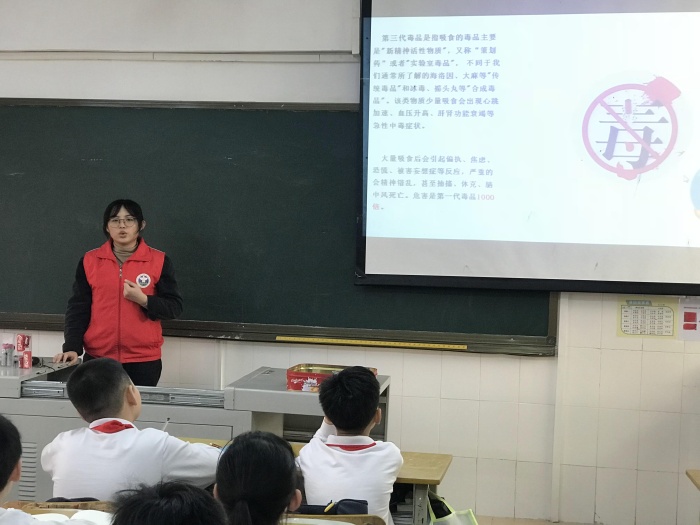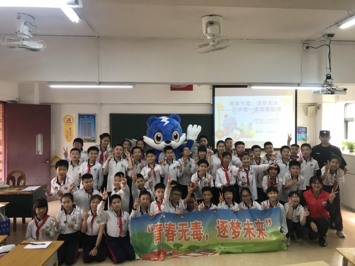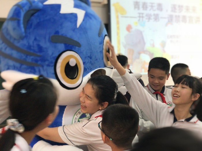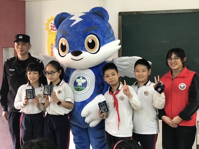 接著,石岐禁毒辦的社工紀燚娥姐姐向同學們宣傳毒品預防知識。廣東的禁毒吉祥物——“粵虎”也來到同學們中間,大大吸引了同學們對活動的興趣。紀姐姐首先向同學們介紹禁毒吉祥物“粵虎”外形的象征意義,接著向同學們介紹了第三代毒品的特點、種類以及危害,加深了同學們對毒品的認識,增強了同學們遠離毒品,拒絕毒品的決心和意識。最后一個環(huán)節(jié)——粵虎考考你,同學們積極踴躍的搶答禁毒問題,把活動推向了高潮。
