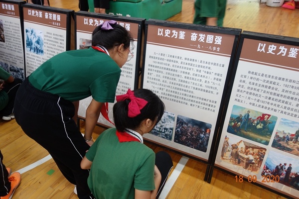 升旗儀式后五桂山學校全體師生移步到學校體育館,參觀了國防教育知識展覽。詳實的圖片讓師生們進一步明白了落后就要挨打的道理。五桂山學校黨支部還在9月18日當天通過召開“九?一八”紀念日專題教育會,開展《習近平談治國理政(第三卷)》專題學習等形式進行系列國防教育活動。