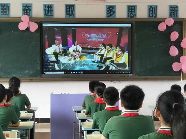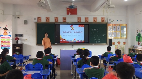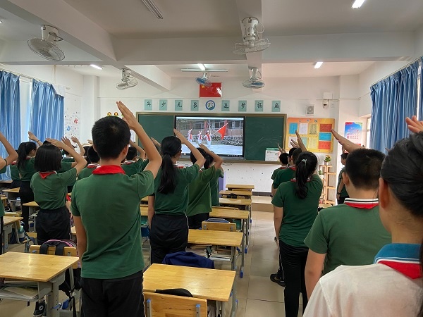 為開展本次活動(dòng),師生代表們積極配合大隊(duì)部做好各項(xiàng)前期準(zhǔn)備工作?;顒?dòng)當(dāng)天,“致敬先鋒 爭當(dāng)抗疫小衛(wèi)士”活動(dòng)分享、教師代表祝福、抗疫事跡分享、出旗、唱隊(duì)歌等環(huán)節(jié)通過釘釘直播方式舉行,各班以中隊(duì)為單位在課室觀看、參與活動(dòng)。活動(dòng)中,學(xué)校黨支部陳玉玲書記通過視頻給同學(xué)們送來寄語:希望孩子們心懷感恩,珍惜時(shí)光,努力學(xué)習(xí),積極鍛煉身體,心有榜樣,將來做一個(gè)對(duì)國家、對(duì)人民、對(duì)社會(huì)有貢獻(xiàn)的人才。
