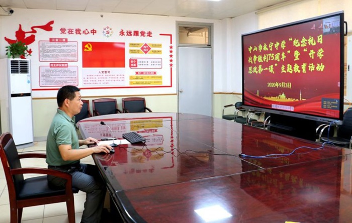 2020年9月3日,是中國(guó)人民抗日戰(zhàn)爭(zhēng)勝利75周年紀(jì)念日,也是值得每個(gè)中國(guó)人銘記的日子!8點(diǎn)40分,中山市永寧中學(xué)全體師生在各班教室舉行“紀(jì)念抗戰(zhàn)勝利75周年”主題校會(huì)。學(xué)校使用釘釘群進(jìn)行線上直播,楊青華副校長(zhǎng)主持。