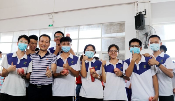 陳清茂校長帶領(lǐng)學(xué)校領(lǐng)導(dǎo)班子和全體老師,為初三年級每位同學(xué)送去一份“特別禮物”——紅彤彤的大蘋果。希望同學(xué)們吃大蘋果,取得好結(jié)果,也希望同學(xué)們順其自然、輕松平和赴考,永寧中學(xué)2020屆紅紅火火、碩果累累。
