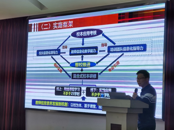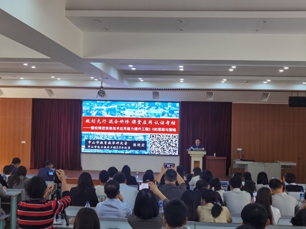 本次會議主要由中山市教育教學教研室,中山市信息技術教研員,中山市能力提升工程2.0辦公室陳明宏主任做了名為《規(guī)劃先行 混合研修 課堂應用 認證考核》整校推進信息技術應用能力提升工程2.0的思路與策略的主題培訓,陳主任主要從提升工程2.0的任務要求,校本研修與考核的實施策略,一劃兩案的制定思路等3個方面給與會人員進行了長達兩個半小時的培訓。