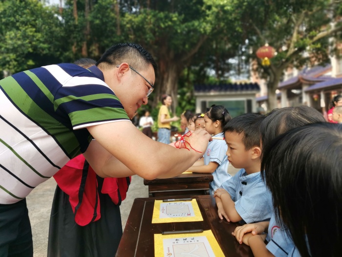 “開筆禮”活動在煙洲書院舉行,煙洲小學131名一年級新生及其家長參加了此項盛典。孩子們懷著無限的憧憬和期待,在老師們和家長們的引領下,在擁有147年歷史的煙洲書院中開啟了人生的新篇章。“開筆禮”在副校長楊志堅敲響的鐘聲中拉開了帷幕,活潑可愛的孩子們認真聆聽了校長黃文華的對他們的諄諄教誨,接著在悠揚的傳統(tǒng)音樂聲中,老師們?yōu)槿w孩子“朱砂啟智”,寓意孩子們能夠開啟智慧,從此耳聰目明、心靈手巧。然后就是家長們認真地教孩子們書寫“人”字。以“人”開筆,寓意著孩子從小就要認識到學會做人的重要性,將來做一個頂天立地的人?!叭恕弊謱懞煤螅⒆觽冇杉议L領著緩緩走進莊嚴神圣的煙洲書院參拜萬世先師孔子。羅勇志老師帶領全體學生整理衣冠,誦《弟子規(guī)》(節(jié)選),三拜圣人孔子,三擊鼓明志,三位學生代表向老師敬茶,這些都寓意著學生們要尊師孝親、崇德立志、仁愛處世的中華傳統(tǒng)文化精髓,樹立“善 ” “正 ”行為規(guī)范,汲取尊師愛學的思想精華。最后,何彩云老師代表全體老師作了發(fā)言,表了決心。