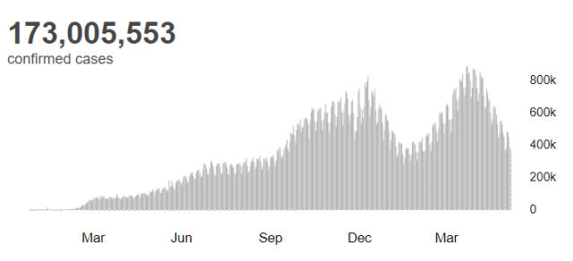 根據(jù)世衛(wèi)組織最新實(shí)時統(tǒng)計(jì)數(shù)據(jù),截至歐洲中部夏令時間6月7日16時55分(北京時間6月7日22時55分),全球累計(jì)新冠肺炎確診病例173005553例,累計(jì)死亡病例3727605例。7日全球新冠肺炎確診病例新增368456例,死亡病例新增8661例。