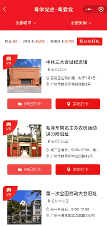 廣大黨員干部群眾隨時(shí)隨地拿起手機(jī)掃描二維碼或在微信小程序搜索“打卡廣東紅”,即可進(jìn)入頁(yè)面,通過(guò)線上或線下實(shí)地打卡等方式,馬上進(jìn)入上百個(gè)重要地標(biāo)、重要革命遺址、重大事件發(fā)生地、革命紀(jì)念館等參觀學(xué)習(xí),或看或聽(tīng),或進(jìn)或出,輕松自如。