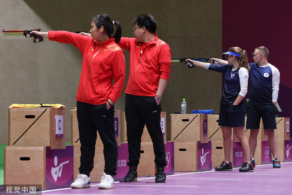 7月27日,2020年東京奧運會混合團體十米氣手槍展開獎牌爭奪戰(zhàn)。中國組合龐偉/姜冉馨在開局0-4落后的情況下實現(xiàn)逆轉(zhuǎn),以16-14險勝俄羅斯奧運選手隊,為中國代表團奪下本屆奧運會第7金,烏克蘭擊敗塞爾維亞獲得銅牌。