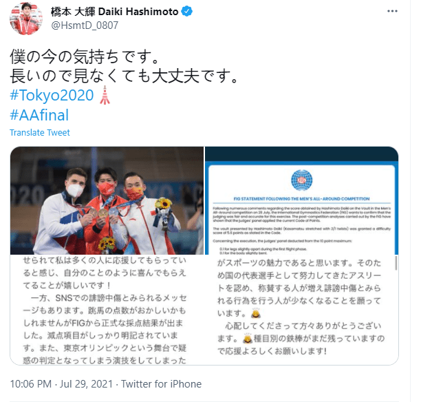 隨后,橋本大輝也在自己的個人社交媒體賬號上發(fā)文回應此事,他發(fā)了一張三位獲獎選手的合影和打分明細的圖片并配以長文。橋本大輝寫道:“這兩天我收到了人們的贊美、同時也在網(wǎng)上聽見了很多誹謗和中傷的聲音。這次我(單腳踩出界)的14.7分的分數(shù)雖然讓人覺得存在疑問,但是這個項目得扣分情況已經(jīng)清楚地列出來了。我們運動員都一樣,在比賽中必須要面對嚴格的評判和分數(shù),這次比賽也是如此,分數(shù)都是客觀給出、而不是主觀打分的,我相信所有在場選手也都知道這些規(guī)則。雖然奧運會還在繼續(xù),但是能夠在臺上和大家比拼已經(jīng)是我很寶貴的經(jīng)歷,互相切磋、互相贊美,這就是體育比賽的魅力所在。因此,我希望贊美奧運運動員的人可以更多、而攻擊謾罵的聲音可以變得更少?!?/p>