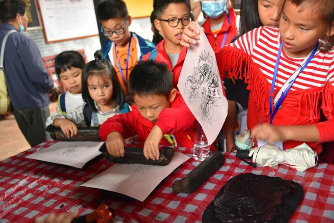 隨后,工作人員示范木版年畫的制作流程。只見,她左手輕壓住木版的一角,右手握住刷子蘸滿特制的顏料,將顏料慢慢沒過木版的線條,隨后快速將一張宣紙鋪于版上,用刷子均勻拓印,再使用雙手將宣紙掀開,魚躍龍門的形象頓時躍然紙上,引得小記者們紛紛排隊(duì)體驗(yàn)。