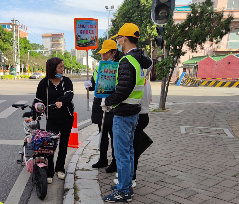 從11月起,不少市民留意到,中山市南頭鎮(zhèn)多個(gè)路口出現(xiàn)了一群醒目的身影:他們身穿熒光色志愿者馬甲,頭戴小黃帽,手舉勸導(dǎo)牌,勸告來來往往的摩托車、電動(dòng)自行車駕乘人員遵守交通法規(guī),佩戴安全頭盔。