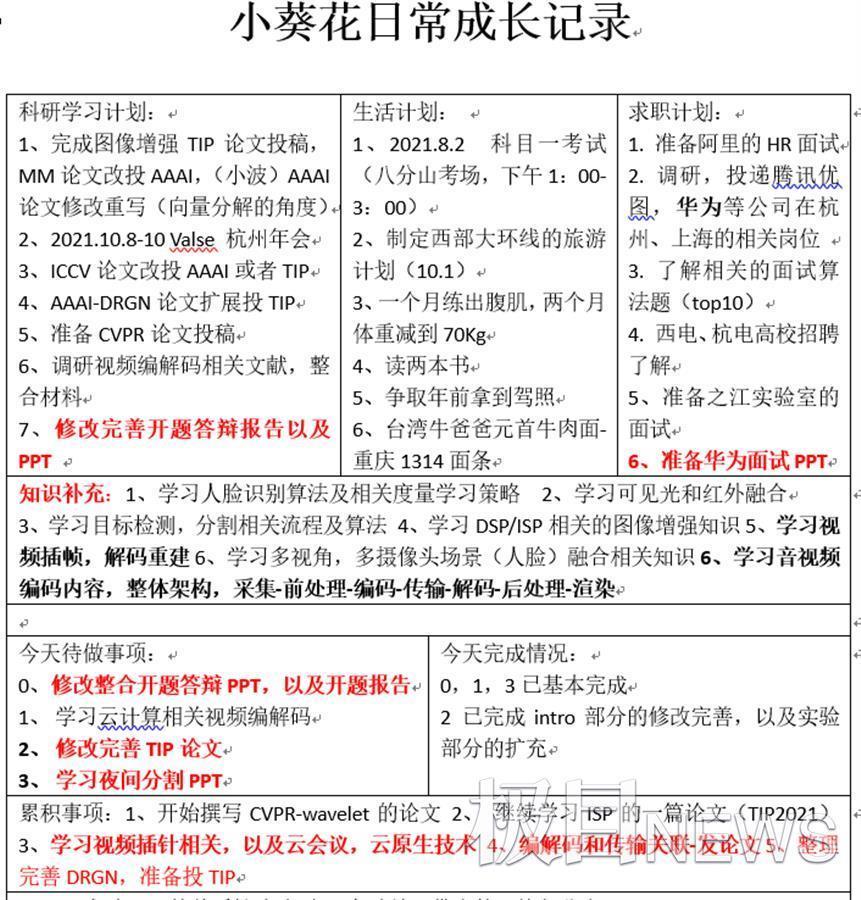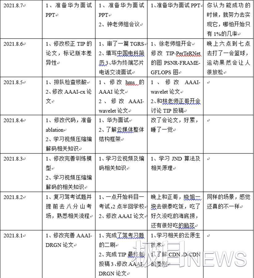 “我在完成一篇論文的時(shí)候,已經(jīng)在寫下一篇論文了,同時(shí)還在做下下篇論文設(shè)想驗(yàn)證。這樣時(shí)間是連續(xù)的,形成一個(gè)閉環(huán),中間不會(huì)有空窗期。而且還可以及時(shí)發(fā)現(xiàn)存在的問題,互補(bǔ)優(yōu)化?!苯f,他每天都會(huì)把所有需要完成的事情按照重要程度排序,細(xì)分到每一天的早、中、晚,合理分配在自己的時(shí)間記錄表里。每天晚上,他會(huì)對(duì)照時(shí)間表進(jìn)行總結(jié),查找遺留問題,并記錄一些自己的想法。
