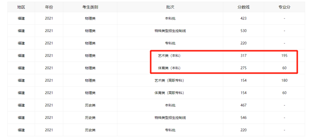 以2021年廈門高考分數(shù)線為例,理科最低分線為423分,藝術(shù)類分數(shù)線為317分,整整差了106分,也就是說,之前藝考生考318分就能跟424分上同等的本科院校。