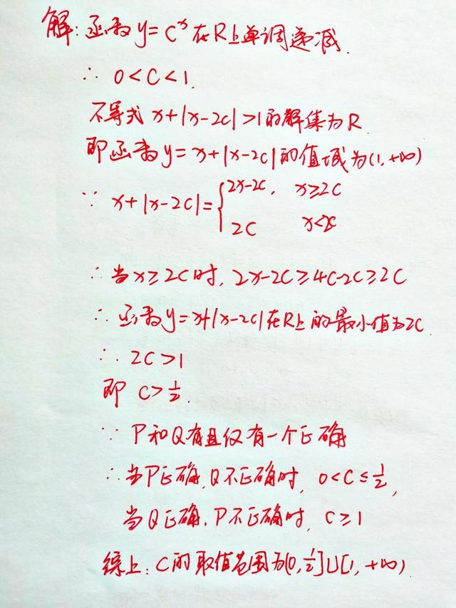Q為真時(shí),即不等式x+|x-2c|>1的解集為R,則等價(jià)于函數(shù)y=x+|x-2c|的值域?yàn)?1,+∞)。要求這個(gè)函數(shù)的值域,需要先去掉絕對(duì)值符號(hào),即需要對(duì)x進(jìn)行分類討論:當(dāng)x≥2c時(shí),y=2x-2c;當(dāng)x<2c時(shí),y=2c。又x≥2c時(shí),y=2x-2c≥4c-2c=2c,所以函數(shù)y的最小值就是y=2c,則有2c>1,即c>1/2。