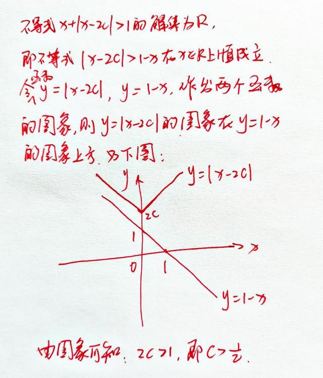 由x+|x-2c|>1得:|x-2c|>1-x,然后設(shè)構(gòu)造兩個(gè)函數(shù),y=|x-2c|和y=1-x,此時(shí)原不等式就轉(zhuǎn)化為兩個(gè)函數(shù)大小的比較。接下來先作出函數(shù)y=1-x的圖像,因?yàn)閨x-2c|>1-x,即函數(shù)y=|x-2c|的圖像始終在函數(shù)y=1-x的圖像的上方,由此即可求出c的取值范圍。