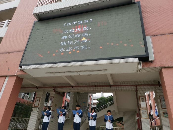 在紀(jì)念活動的第二部分,鄒老師介紹了南京大屠殺的概況,并重溫了國家設(shè)立南京大屠殺公祭日紀(jì)念活動的相關(guān)視頻,悲壯的音樂、肅穆的畫面,讓全體師生仿佛重回到了83年前的南京,看到了河山被踐踏、同胞被屠殺。最后全體師生情悲意堅(jiān),握緊拳頭、抬起頭顱高聲齊誦公祭日的《和平宣言》?;顒雍?,校長吳劍文勉勵(lì)全體師生要銘記歷史傳承精神、勿忘國恥振興中華,要教師踐行立德樹人為人師表,要學(xué)生學(xué)好本領(lǐng)報(bào)效祖國。