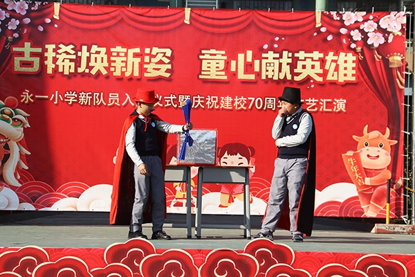 為慶祝該學(xué)校建校七十華誕,激勵全校師生不忘初心,牢記使命,堅定信心,共建共進,早日把永一小學(xué)建成“小而美,小而精,小而優(yōu)”的現(xiàn)代化學(xué)校。2020年12月31日下午,坦洲鎮(zhèn)永一小學(xué)舉行“古稀煥新姿,童心獻英雄” 新隊員入隊儀式暨慶祝建校70周年文藝匯演。