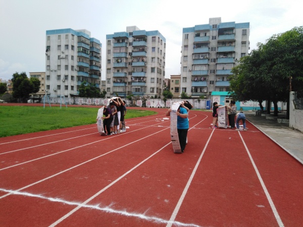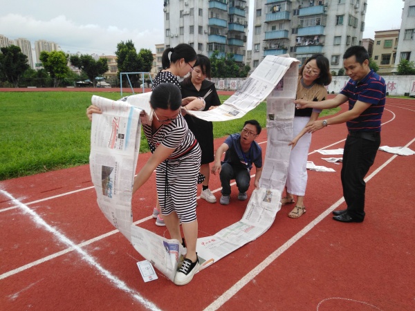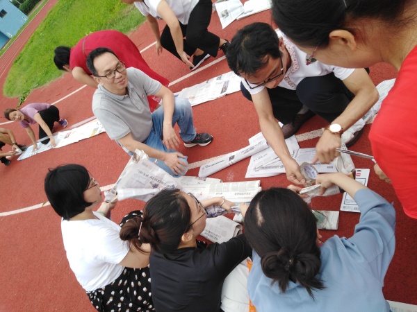然后全體老師到達(dá)運(yùn)動場開始活動。隨著哨聲響起,各組隊(duì)員馬上分工合作:有的指揮、有的折報紙、有的粘膠帶。很快就做出了報紙大圓環(huán)、全組隊(duì)員在圓環(huán)里面滾動到達(dá)終點(diǎn)。每一個環(huán)節(jié)都牽動著隊(duì)員的心弦,同呼吸,共命運(yùn),彼此加油、歡呼、鼓勁,讓身心得到放松。