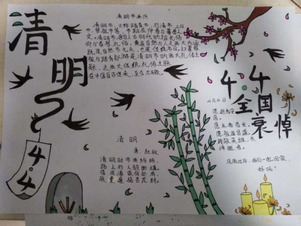 4月上旬,分別組織全體學(xué)生參加全國哀悼日悼念活動、制作清明節(jié)主題手抄報、開展頌英雄,寫英雄的征文活動等。