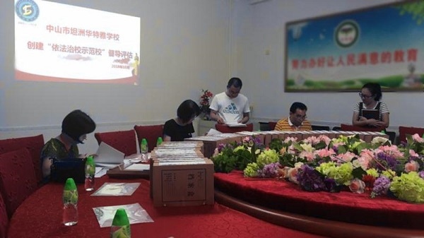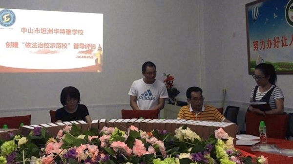 2018年10月8日,坦洲鎮(zhèn)教育事務(wù)指導(dǎo)中心黃華福副主任率領(lǐng)督導(dǎo)檢查組,對(duì)坦洲華特雅學(xué)校申報(bào)中山市依法治校示范校進(jìn)行核查認(rèn)定。