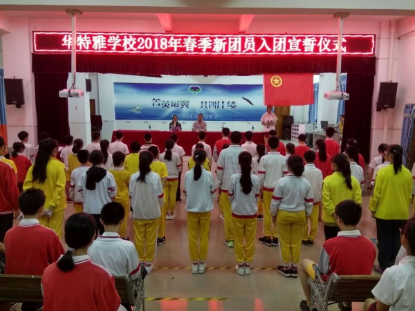 2018年5月4日中午,華特雅學(xué)校2018年春季新團員入團宣誓儀式在學(xué)校報告廳舉行。學(xué)校副校長何偉華、初中部德育主任鄧財秀、初中部教務(wù)處主任段銀燈和團委書記駱貞義參加了本次會議。