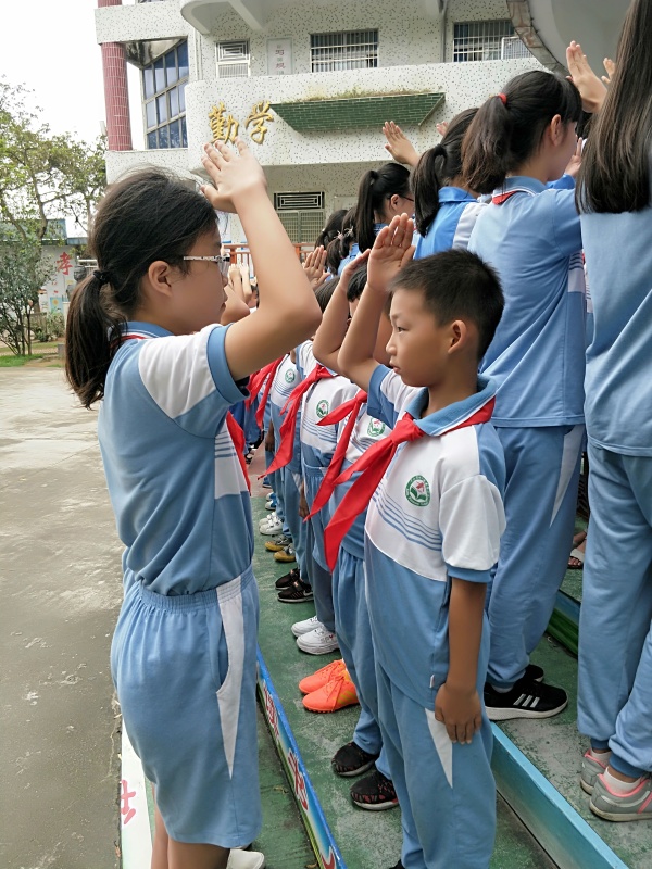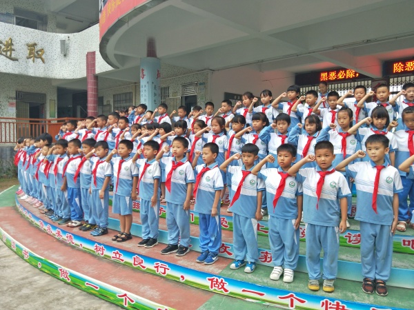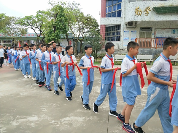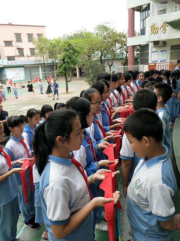 安阜小學(xué)少先隊(duì)開展“喜迎六一 祝福祖國”向新中國70周年華誕獻(xiàn)禮活動,5月30日下午,坦洲鎮(zhèn)安阜小學(xué)大隊(duì)部在操場舉行“扣好人生第一??圩印?新生入隊(duì)儀式。115名一年級的學(xué)生,經(jīng)過兩周的隊(duì)前學(xué)習(xí),今天欣喜地佩戴上紅領(lǐng)巾,光榮地加入中國少年先鋒隊(duì)組織。