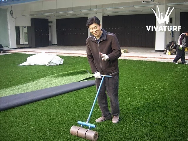 利用專用涂膠工具在人造草坪背面涂膠,涂膠厚度要一樣,不能出現(xiàn)高低現(xiàn)象;涂膠速度要均勻,不能反復(fù)涂膠;在涂膠干燥完成后,進行粘合人造草坪粘合完工后,利用專用加壓工具,使人造草坪密實度緊實;之后,進行人造草坪清理,人造草坪固化利用三天時間對人造草坪進行檢查和修整。