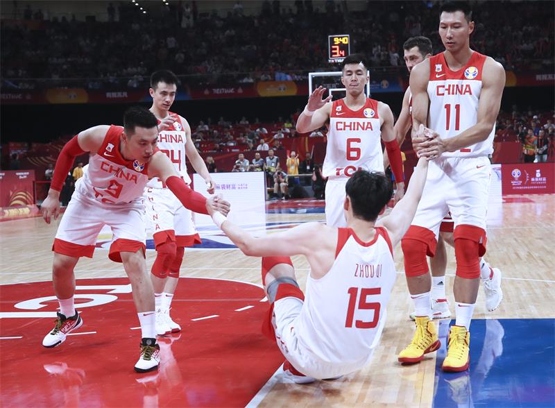 9月2日,中國(guó)隊(duì)球員翟曉川(左一)、易建聯(lián)(右一)拉起摔倒的隊(duì)友周琦。新華社記者蘭紅光攝