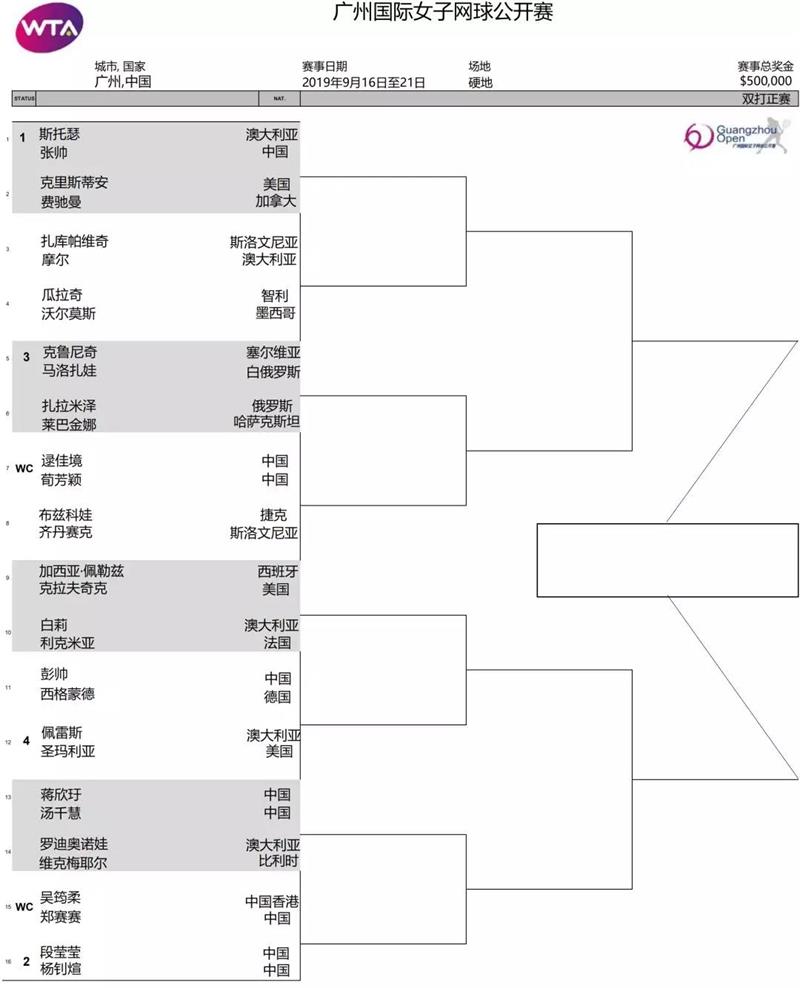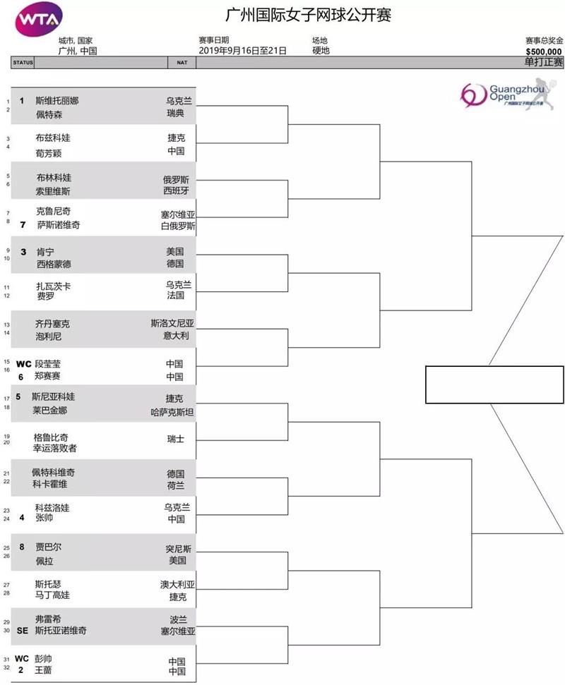 北京時間9月15日,2019廣州國際女子網(wǎng)球公開賽正賽單打簽表出爐。賽會頭號種子、烏克蘭名將、現(xiàn)世界第三斯維托麗娜和衛(wèi)冕冠軍、中國金花王薔分列頭兩號種子,各自鎮(zhèn)守上下半?yún)^(qū),首輪分別面對瑞典選手彼得森和另外一位中國金花彭帥。