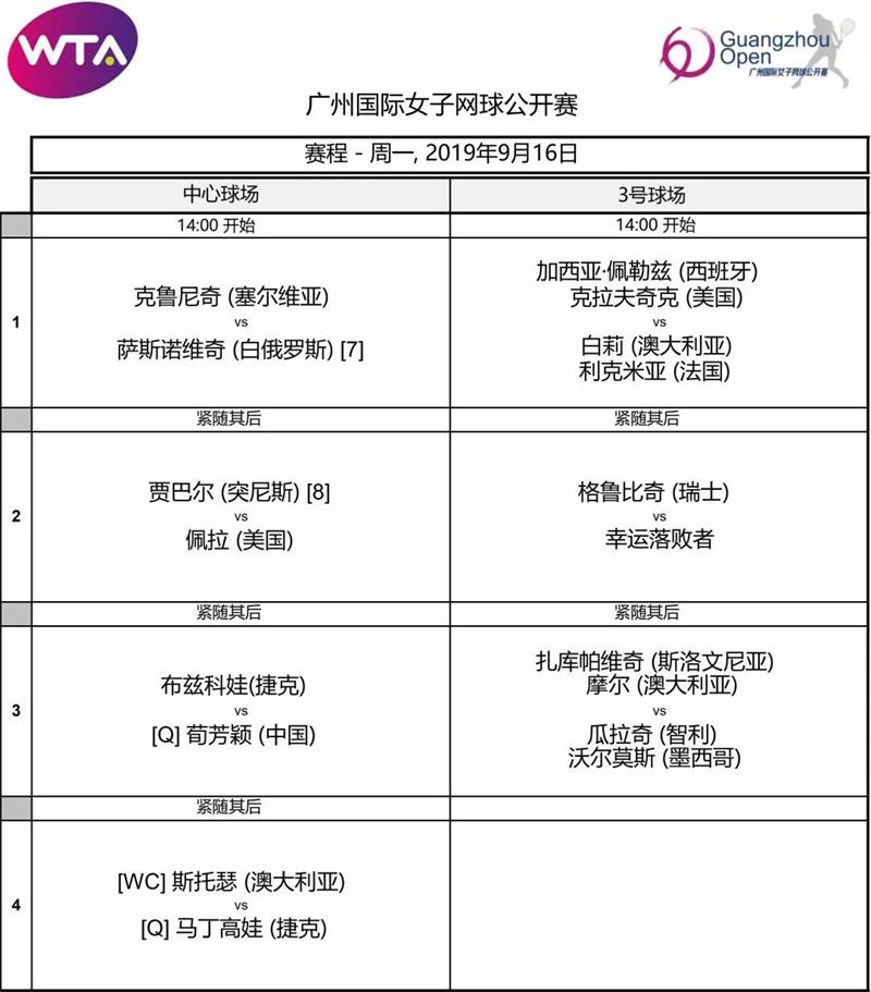 正賽第一日賽程同樣在今天揭曉,7號種子薩斯諾維奇與2017年賽會亞軍克魯尼奇之間的強強對話率先于北京時間下午2點在中心球場開打。隨后進行的是8號種子、突尼斯名將賈巴爾與美國球員佩拉的對決。從資格賽突圍的中國金花荀芳穎將迎來連續(xù)作戰(zhàn),對陣捷克小將、2019羅杰斯杯女單四強布茲科娃。壓軸亮相中心場的將是大滿貫單雙打得主、澳洲名將斯托瑟,她將迎來資格賽選手馬丁高娃的考驗。
