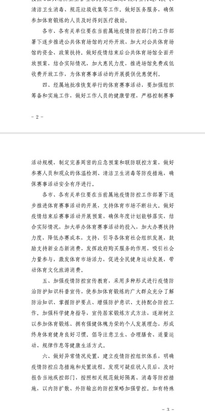 “通知”同時指出,在場館開放、賽事舉辦的恢復工作中,要堅持疫情防控優(yōu)先,明確防控責任,經(jīng)屬地批準恢復開放的公共體育場館和經(jīng)屬地批準恢復舉行的體育賽事活動,都要加強各項防控工作,做好登記管理、監(jiān)測體溫、限流等工作。