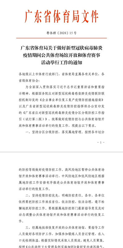 3月5日,廣東省體育局發(fā)布《廣東省體育局關(guān)于做好新型冠狀病毒肺炎疫情期間公共體育場館開放和體育賽事活動舉行工作的通知》(以下簡稱“通知”),按照“堅持分區(qū)分級防控,落實屬地管理”的要求,中風險地區(qū)和低風險地區(qū)根據(jù)屬地防控工作安排,有序推進公共體育場館開放和體育賽事活動舉行的恢復工作。