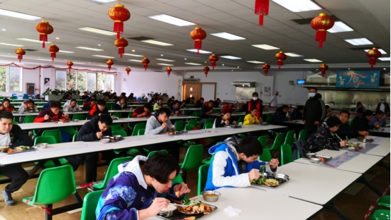 中心對(duì)進(jìn)入食堂就餐人員要求佩戴口罩,為就餐人員配發(fā)一次性手套,對(duì)各隊(duì)伍進(jìn)行分時(shí)段錯(cuò)峰就餐,在就餐之前,還有專人監(jiān)督就餐人員餐前洗手。為盡可能降低飛沫傳播的風(fēng)險(xiǎn),食堂實(shí)行分菜制和人員保持寬松位置就餐,用餐時(shí)按指定座位單向就座,就餐人員間隔一個(gè)座位就餐,并建議就餐人員建議吃飯少說話。