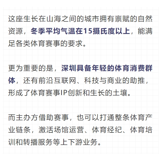 緣何越來越多的高端體育賽事落戶深圳?在業(yè)內(nèi)人士看來,深圳有著獨(dú)天獨(dú)厚的優(yōu)勢: