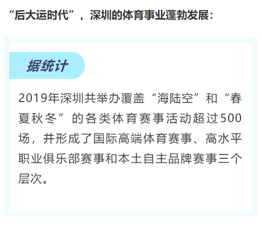 在深圳經(jīng)濟(jì)特區(qū)建立40周年之際,深圳已經(jīng)是每年舉辦超過500場賽事的體育賽事之城?,F(xiàn)如今,站在新起點(diǎn)的深圳,正向著打造國際體育賽事之都的目標(biāo)邁進(jìn)。